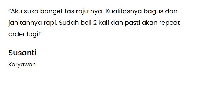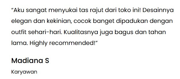 Kenapa Memilih Kami 1. Handmade Berkualitas Tinggi Setiap tas dibuat secara manual oleh pengrajin berpengalaman, memastikan hasil yang rapi, kuat, dan tahan lama. 2. Desain Unik & Kekinian Kami menghadirkan model tas rajut yang modern, elegan, dan berbeda dari yang lain. 3. Bahan Premium Benang pilihan yang nyaman, ringan, dan tidak mudah rusak. 4. Produk Lokal, Rasa Internasional Mendukung perajin lokal sekaligus mendapatkan produk berkelas. 5. Layanan Ramah & Responsif Kami siap membantu mulai konsultasi warna hingga pemesanan custom. Produk Tas Rajut Ocean Knot Rp. 75.000,00 Cherry Charm Rp.120.000,00 Hubungi Kami Apa Kata Mereka??? Lokasi